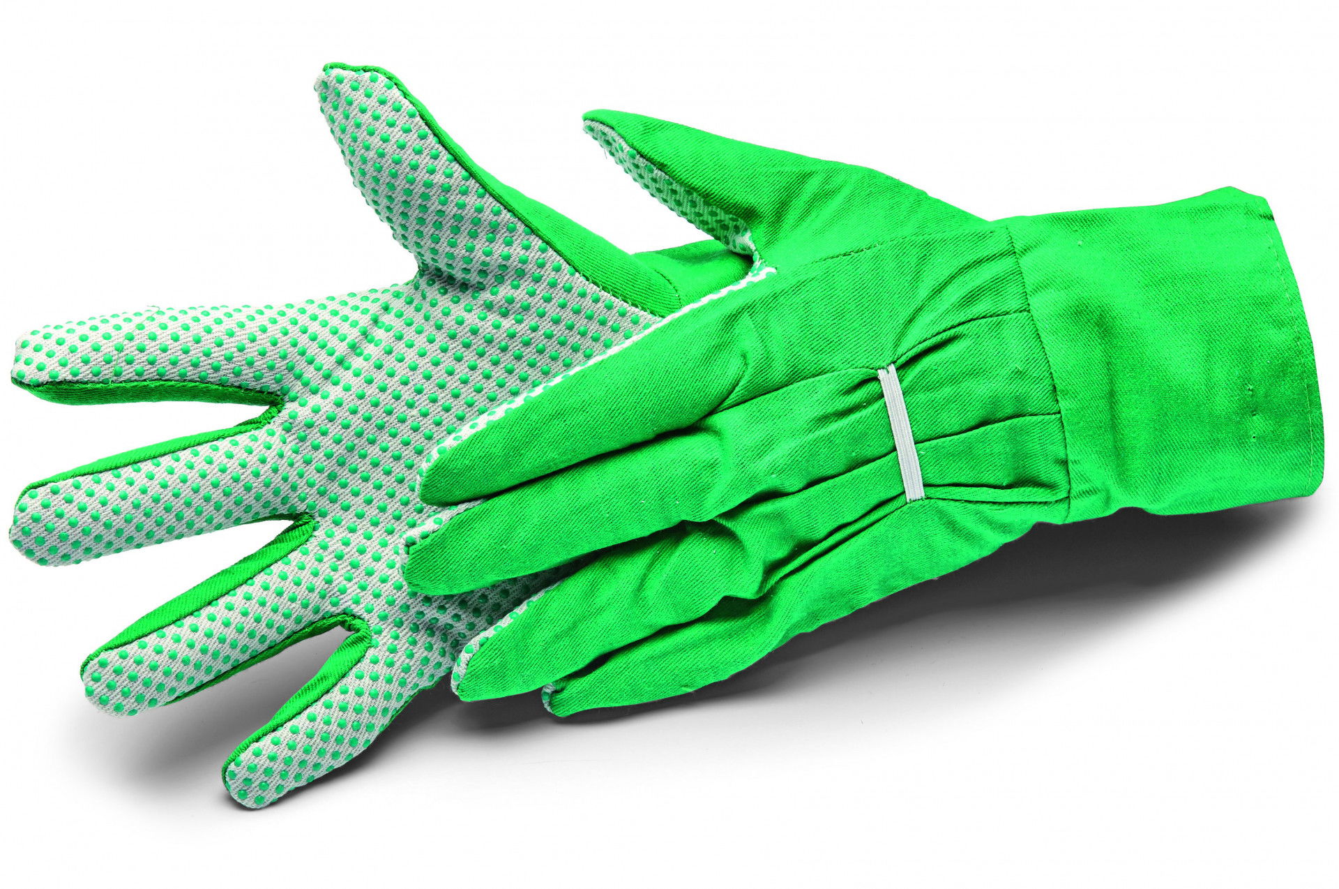 - Pamut kerti kesztyű pettyekkel a tenyéroldalon és gumiszalaggal a kézháton.